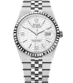 Land-Dweller 36 in Oystersteel and white gold with a deep white dial, honeycomb pattern and Flat Jubilee bracelet. Fluted bezel. Caliber 7135.